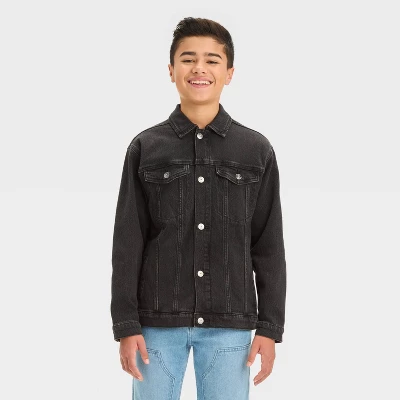Your child will love adding this Denim Trucker Jacket from art class™ to their outerwear collection. Made of midweight cotton with spandex and comfy lining, this black denim jacket has a collared neckline with a full-length button-down front, a paneled construction with stitching details, long sleeves with buttoned cuffs and four functional pockets. Tailored in a regular fit, this trucker jacket makes a fun layering piece for everyday wear.