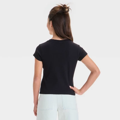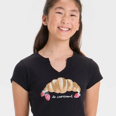 Let them step up their casual outfit game with this Short-Sleeve Notched Neck Graphic T-Shirt from art class™. Made from a fabric blend of recycled polyester, recycled cotton, cotton and spandex, this ribbed T-shirt showcases a graphic of a croissant along with “Le croissant” text. Featuring a notched neckline, this short-sleeve top pairs well with a variety of jeans, skirts and shorts.